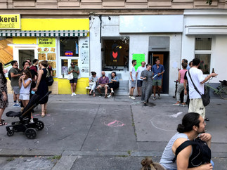 Musical performance by Barbis Ruder, David Pridal, and Esther Wratschko was held at the gallery plaza open to the public with musical instruments made by Osama Zatar from converted weapons.